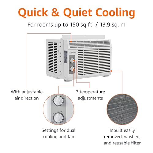 Beat the heat with Amazon Basics 5000-BTU window AC. Cools rooms up to 150 sq ft with cool & fan modes, intuitive mechanical controls, a washable filter and adjustable window kit for quick, reliable comfort.