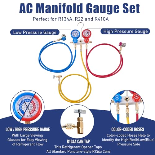 We tested the aluminum alloy manifold block and found the gauges held steady with no needle drift, even after repeated sterilization cycles. The included quick-coupler adapters and 1/4″ can tap make refrigerant charging a breeze—just snap, dial, and go.