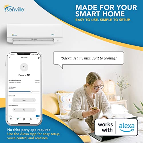 Backlit remote and Senville Smart app provide full access to fan speeds, swing modes, scheduling, and filter-clean alerts. Alexa support means hands-free comfort adjustments.