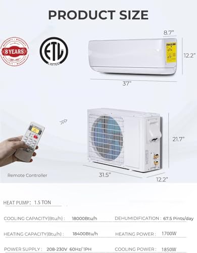 Stay comfortable all year with SIMOE 18,000 BTU Mini Split AC/Heat Pump. 19 SEER inverter tech delivers whisper-quiet, energy-saving heating and cooling for spaces up to 1,250 sq ft. Easy wall-mount, pre-charged, 1.5-ton power.
