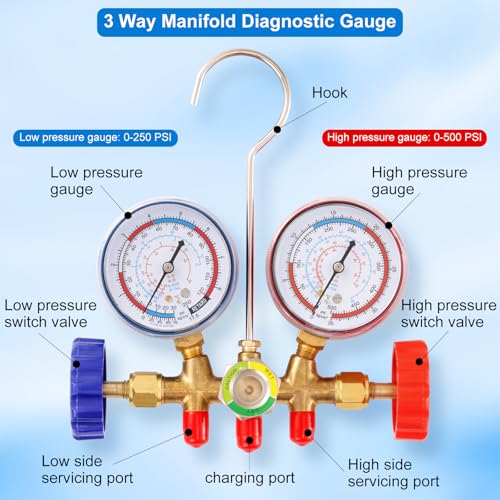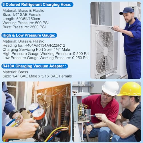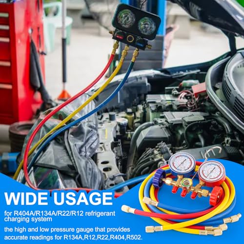 Get precise AC/R work with the Tigbear Manifold Gauge Set: 5ft color-coded hoses, dual 360° brass gauges, leak-tight couplings plus mini-split adapter. Supports R404A, R134A, R22, R12 for quick, accurate charging.